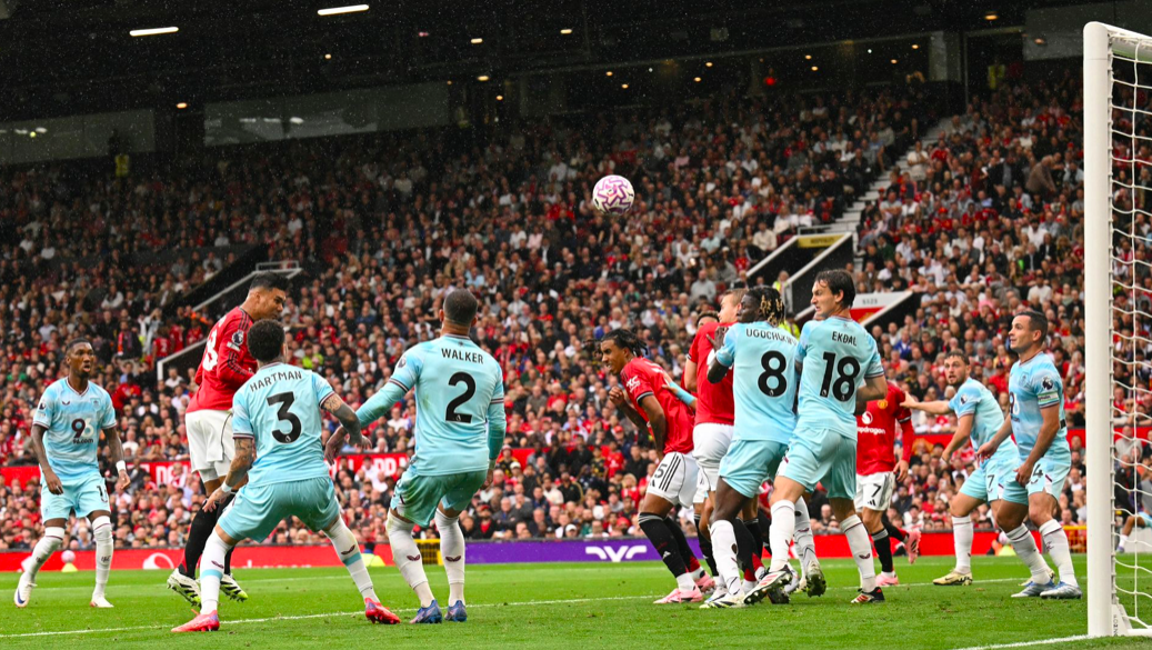 3分钟后,曼联的定位球再次制造威胁,芒特的头球砸在横梁上方。